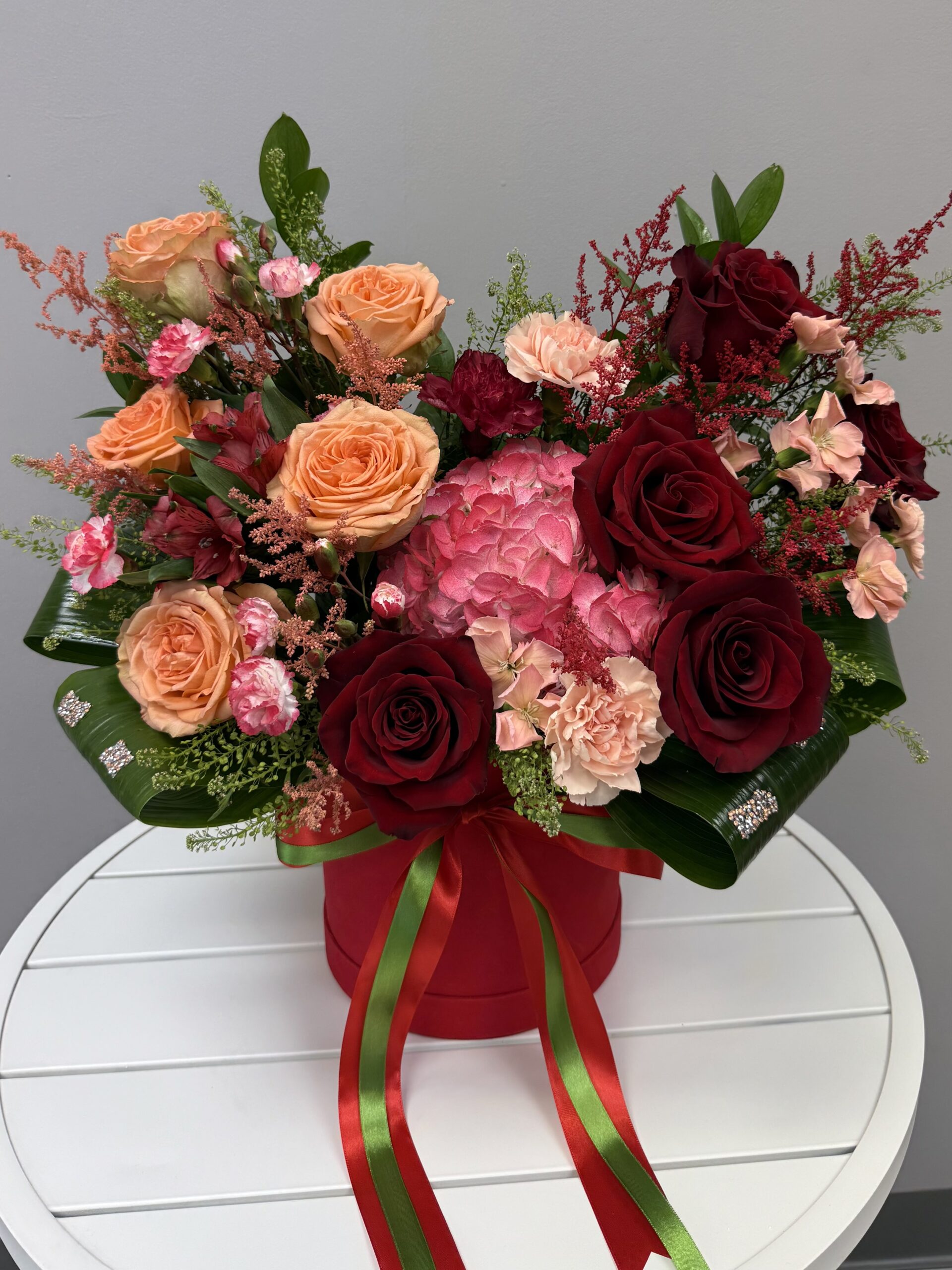 Elegant Rose and Hydrangea Box Arrangement. A beautifully balanced floral design featuring a radiant contrast of peachy-orange and deep red roses, nestled amongst a voluminous pink hydrangea heart. Accented with complementary spray flowers and lush foliage, this premium bouquet is expertly arranged in a stylish red keepsake box. An ideal and elegant gift for a birthday, thank you, or expression of gratitude.
